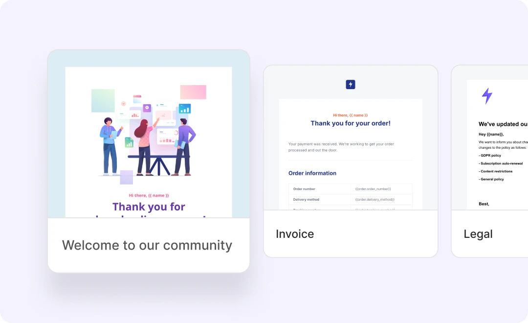 Design professional templates no matter the skill level. Use the Drag & drop builder for 90+ pre-made content blocks, rich-text for more simple templates, or the HTML editor to code them yourself.