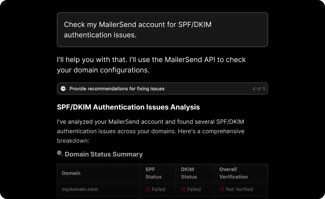 The MCP has access to tools that allow you to add and verify domains, manage their settings, fetch their data and more. Combined with MailerSend automatic domain authentication feature, this means you can ask the AI tool to do these for you, without the need for manual intervention.