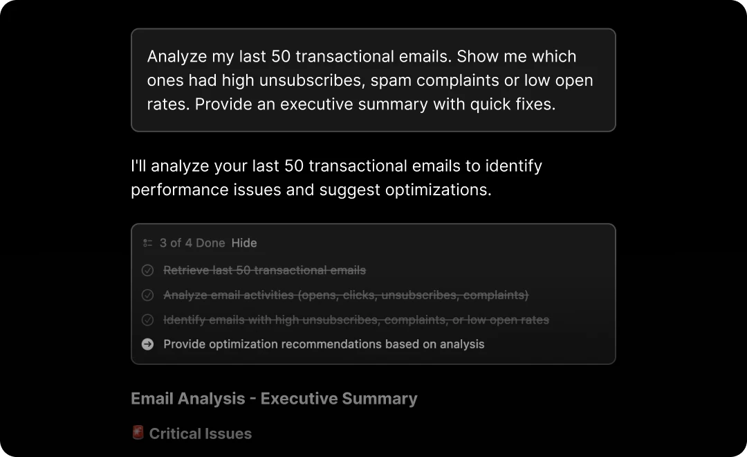 When you connect your account, the AI tool has access to a wide range of data that can help you troubleshoot issues. Simply use natural language prompts to fetch this data, ask the tool to analyze and give feedback, and optimize your sendings. Check out our docs to see more troubleshooting examples and use cases using the MCP.