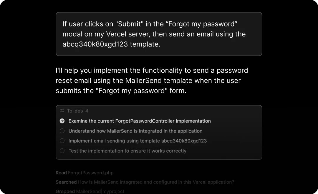 Connect an AI tool to your MailerSend account for live data access that makes task automation faster and more reliable.