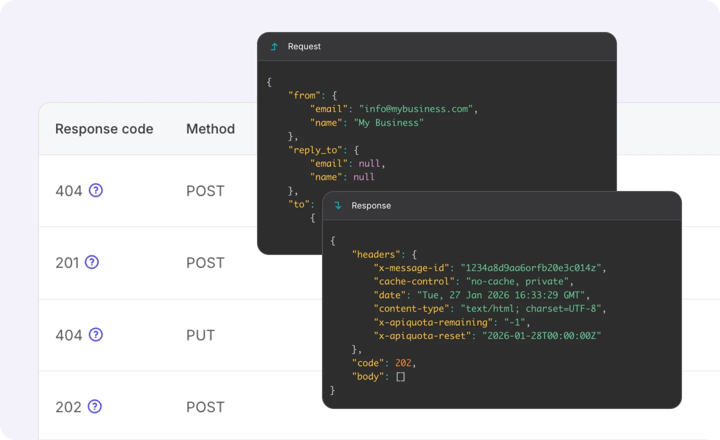 Get full visibility into every API and SMTP request, including the response, endpoint, IP address, and user agent. -