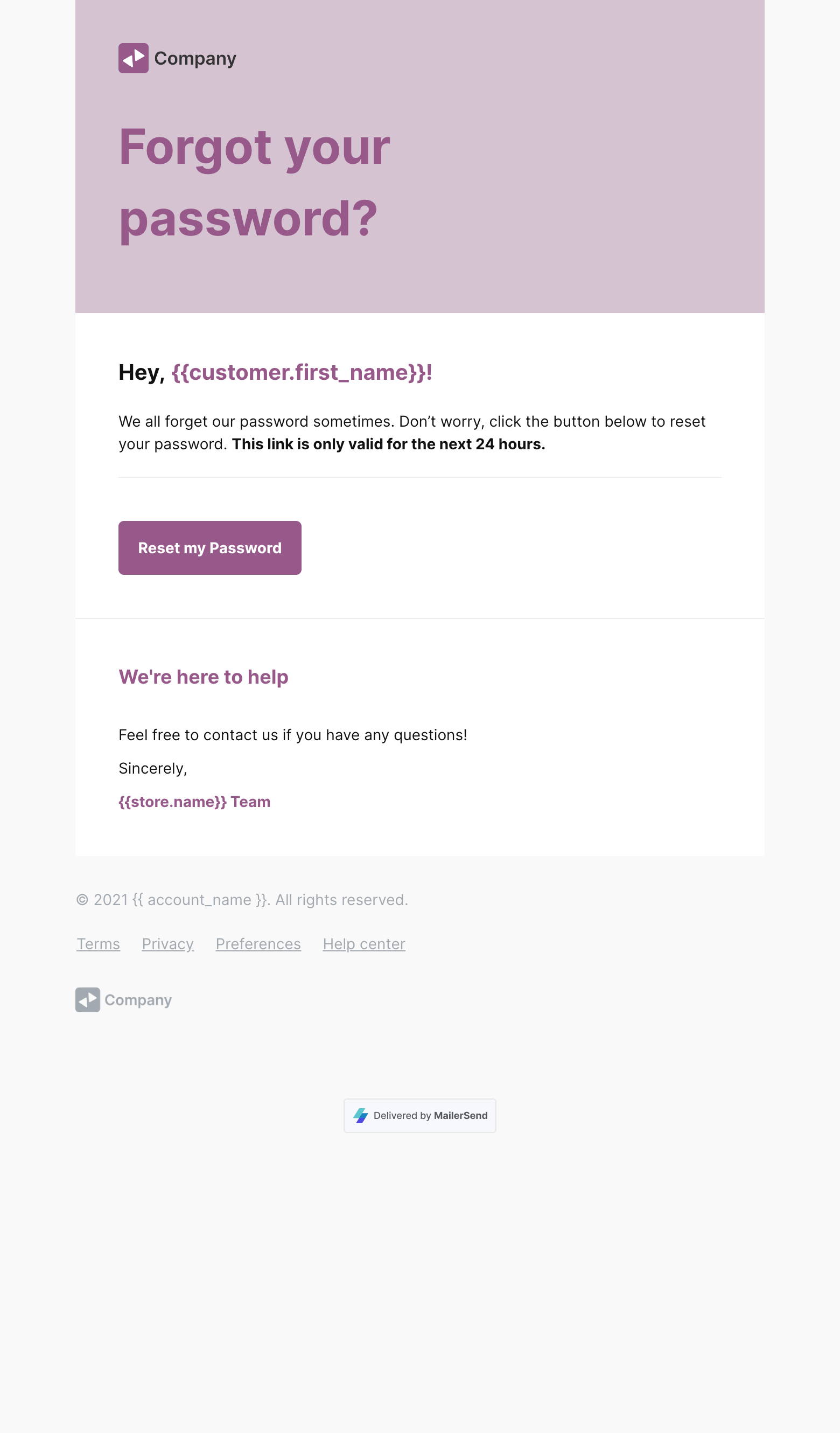 MailerSend's WooCommerce password reset email template is the ultimate solution for enabling customers to effortlessly and securely reset their passwords. With our innovative visual builder, you can easily customize the template to perfectly align with your brand's identity. Say goodbye to the hassle of password resets and give your customers a seamless experience they won't forget. Discover the power of MailerSend's WooCommerce password reset email template today.